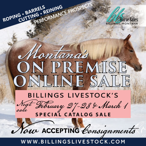 ALL JANUARY 23-24 SALE HORSES WILL BE LOCATED AT BILLINGS LIVESTOCK SALE WEEK AND AUCTIONED LIVE ON SALE DAY THROUGH THE RING – Internet bidding available for Online/ShowCase Internet Sale Session horses offered in this sale